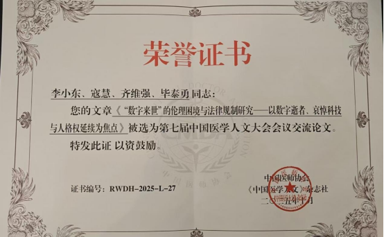 2025年11月8日,第七届中国医学人文大会暨广东省医师协会人文医学专业委员会学术会议在深圳召开。大会青年论坛上,304永利集团官网入口人文医学研究中心硕士研究生李小东凭借论文《“数字来世”的伦理困境与法律规制研究——以数字逝者、哀悼科技与人格权延续为焦点》荣获优秀论文奖,并作为优秀论文代表作大会汇报。本次大会共收到来自全国的305篇论文,评选出了37篇优秀论文,其中有15篇得以在会上进行汇报。