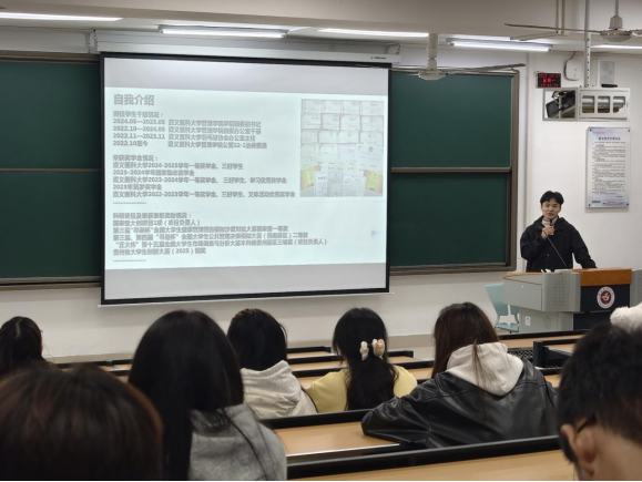 分享会伊始,主持人池易霞致开场白,热烈欢迎公管22-1班许文睿学长及各位同学的到来。随后,许文睿学长登台进行经验分享。首先,他系统地介绍了个人背景以及在大学期间所担任的职务和获得的荣誉。接着,学长分享了自身的学习方法与时间管理技巧,引导同学们如何高效学习并合理分配时间。此外,针对科研、竞赛和考证等议题,学长提出了独到的建议和见解,鼓励同学们全方位发展,积极提升自身能力。随后,分享会进入现场互动环节,同学们踊跃提问,学长逐一耐心解答,并特别强调了心态调整的重要性。最后,主持人池易霞进行总结发言,再次对许文睿学长的精彩分享及各位同学的参与表示感谢。